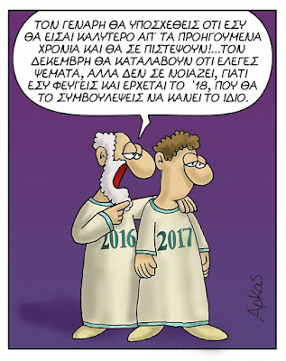 Vuelve a recordarnos Arkás lo que le dice el año envejecido y canoso, medio calvo y barbudo al nuevo e imberbe que entra, y que es, en dos palabras: obsolescencia programada: está previsto que tú, el año supuestamente nuevo, dures trescientos sesenta y cinco días igual que yo, y que las promesas de mejora en general que conllevas (felicidad, realización de todos nuestros más íntimos deseos y sueños de paz en la tierra, armonía, libertad, fraternidad y demás zarandajas) se queden en agua de borrajas y caigan en desuso y el saco roto del olvido por la fuerza misma de la costumbre y el propio funcionamiento de la maquinaria que prevé que así sea y que se alimenta de esas mismas y falsas ilusiones de novedad, de modo que, cuando uno está a punto de descubrir y denunciar el engaño en el que vivimos, se abre paso una nueva institución temporal, que hará su aparición estelar en todos los calendarios y que es "el año nuevo" con idénticas y falsas promesas e ilusiones. ¿Descubrirán alguna vez los humanos seres que el año viejo y el año nuevo, tú y yo, no somos sino el mismo año que gira como la tierra en torno al sol, la misma ave Fénix que muere incinerada y renace de sus propias cenizas?